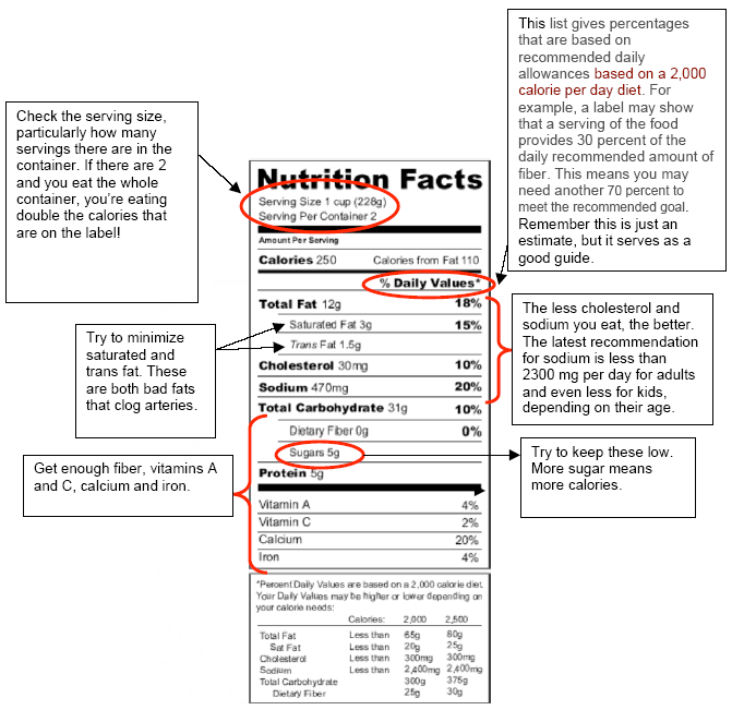 Notice this sample food label shows you what to look for and why! Here is another sample food label: